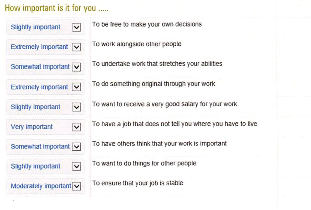 On the next page, select from the drop down menu next to each item how important you believe each item is for you in relation to a job. If you make a mistake, you can select from the menu again.